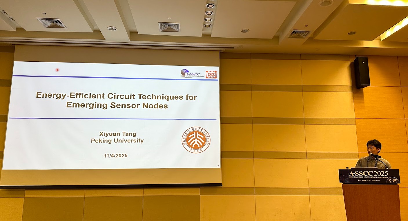 • 2025-11-14 北京大学助理教授唐希源受邀在2025亚洲固态电路会议(A-SSCC) Rising Star Express做报告 近日,2025年亚洲固态电路会议(Asian Solid-State Circuits Conference, A-SSCC)在韩国大田召开。该会议是亚洲地区固态电路领域最具影响力的国际学术会议之一,吸引了来自全球各地的知名专家学者、企业代表及青年研究人员,共同探讨集成电路设计领域的最新研究进展与未来趋势。 唐希源助理教授受邀在“Rising Star Express”专题论坛上作学术报告,题为” Energy-Efficient Circuit Techniques for Emerging Sensor Nodes”。在报告中,唐希源系统介绍了课题组近年来在高性能信号链前端、电容传感读出芯片方面的最新研究成果,涵盖了新型放大器结构、时间域信号处理技术等多个方向。这些研究工作为未来低功耗、智能化的边缘系统提供了新的电路优化方案,也展示了团队在模拟与混合信号集成电路领域的持续创新能力。 A-SSCC每年举行Rising Star Express,邀请四位青年研究人员做相关前沿报告,旨在展示亚洲青年学者在固态电路领域的最新研究成果。 个人简介: 唐希源双...