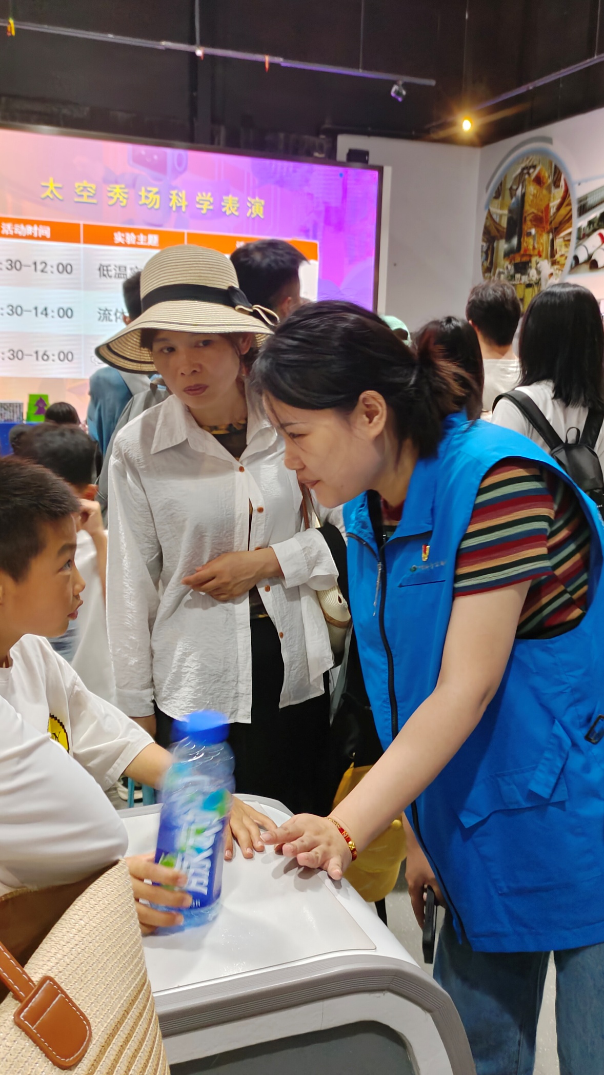 高铭遥和万雨欣两位同志则在科技馆四层表演台负责震撼的低温实验、奇幻的流体实验以及引人入胜的太空实验的现场秩序维护。