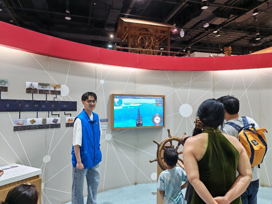 在四层"华夏之光"展厅,鄢泽楠、张誉舰、赵耕墨三位同志负责指南针与航海、玲珑仪两大特色项目,维持现场秩序,为参观者讲解其中蕴含的科学知识,并指导操作细节。通过复原郑和船队的导航术、元代玲珑仪的精妙结构,向观众展现中国古代科技巅峰成就。