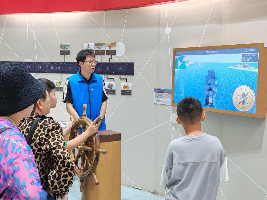 在四层"华夏之光"展厅,鄢泽楠、张誉舰、赵耕墨三位同志负责指南针与航海、玲珑仪两大特色项目,维持现场秩序,为参观者讲解其中蕴含的科学知识,并指导操作细节。通过复原郑和船队的导航术、元代玲珑仪的精妙结构,向观众展现中国古代科技巅峰成就。