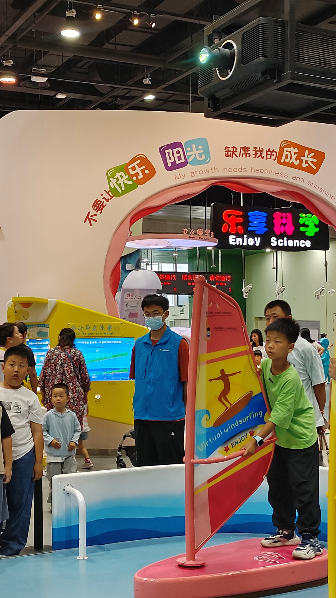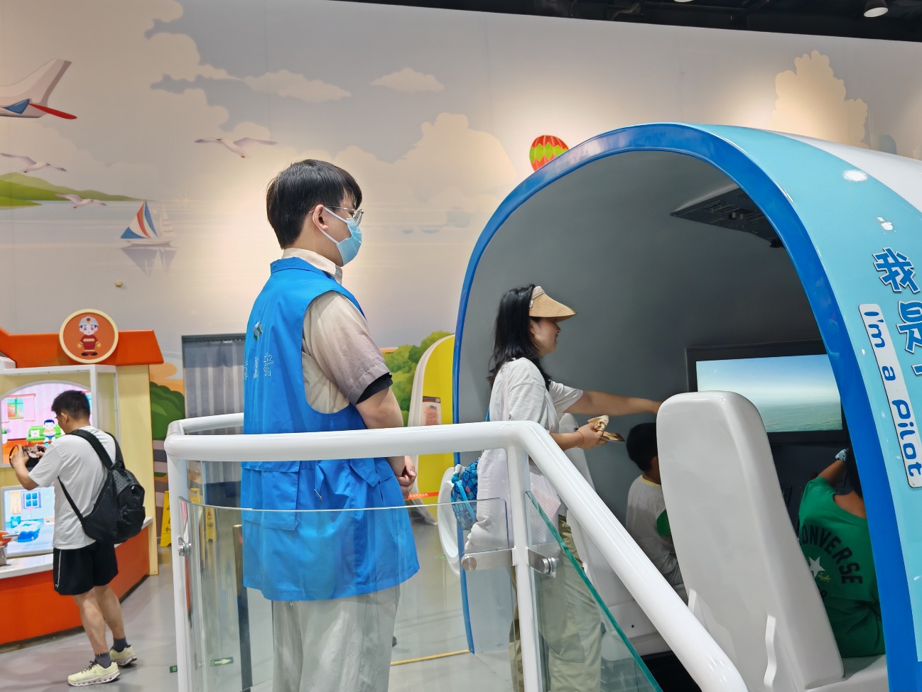 在充满欢声笑语的一层儿童科学乐园,钟婷婷、张博涵、牛晓薇、于凤君和赵星语五位同学负责“帆板”、“体验飞翔”、“我是建筑师”、“出租车”和“模拟飞机”互动项目的引导和保障工作。这些项目巧妙地将科学原理融入趣味体验,让孩子们在玩耍中培养科学思维,收获科学知识。
