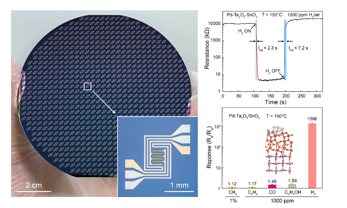 图1 Pd-Ta2O5/SnO2基氢气传感器晶圆及性能展示